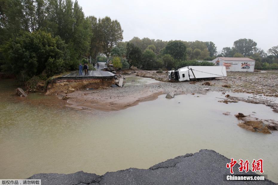 当地时间2018年10月16日,法国孔克,法国暴雨引发突发性水灾,洪水卷走了大量车辆,淹没了房屋,人员伤亡和财产损失惨重。目前,洪水已经导致法国西南部一些河流的水位上升到一个多世纪以来的最高水平。