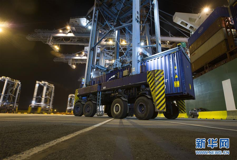 10月15日晚,在比利时泽布吕赫港集装箱码头,跨运车运送集装箱。 新华社记者 叶平凡 摄