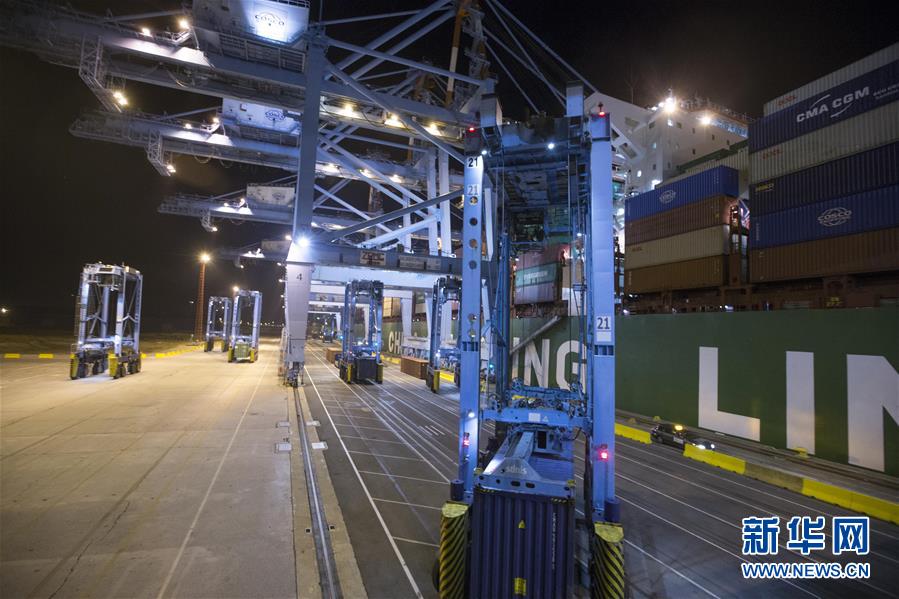 10月15日晚,在比利时泽布吕赫港集装箱码头,跨运车运送集装箱。 新华社记者 叶平凡 摄