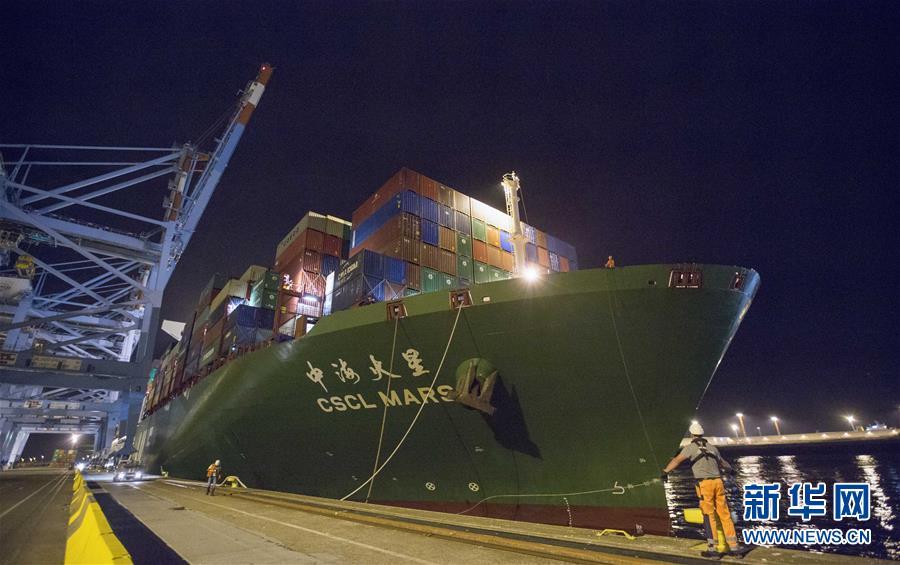 10月15日晚,中远海运旗下的“中海火星”号集装箱轮停靠在比利时泽布吕赫港集装箱码头。 新华社记者 叶平凡 摄