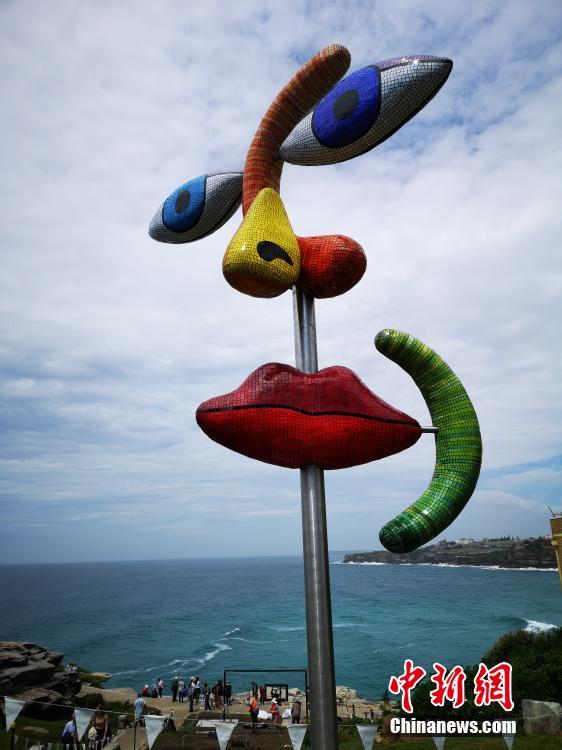 10月18日,第22届澳大利亚邦迪海滩雕塑展在悉尼邦迪海滩开幕。图为雕塑作品吸引参观者。中新社发 王睿 摄