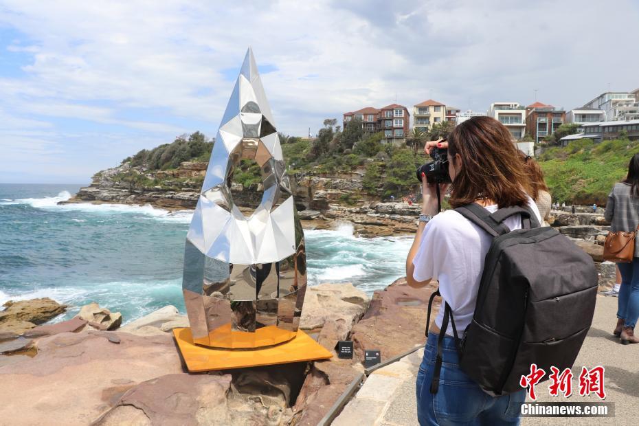 10月18日,第22届澳大利亚邦迪海滩雕塑展在悉尼邦迪海滩开幕。图为雕塑作品吸引参观者。中新社发 王睿 摄