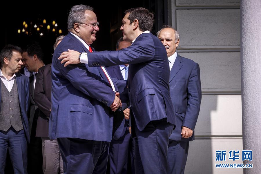 10月20日,在希腊首都雅典,希腊总理齐普拉斯(前右)与辞去外长职务的科恰斯在交接仪式上握手。 新华社发(吉约各斯·康塔里尼斯摄)