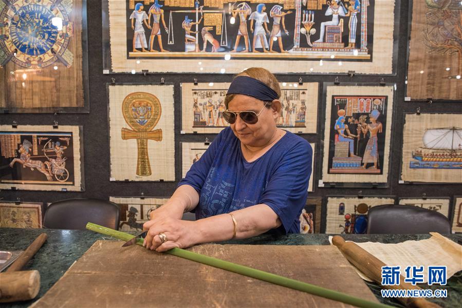 10月20日,在埃及吉萨省,一名莎草画店员工展示莎草纸的制作过程。 一条尼罗河、一束莎草秆,埃及人化草木为神奇,用一幅幅莎草画记录尼罗河两岸人们的生活点滴。这种技艺历经数千年传承,直到今天还在让世人感叹埃及文明的源远流长。 新华社记者孟涛摄