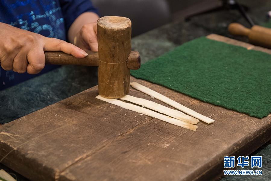 10月20日,在埃及吉萨省,一名莎草画店员工展示莎草纸的制作过程。 一条尼罗河、一束莎草秆,埃及人化草木为神奇,用一幅幅莎草画记录尼罗河两岸人们的生活点滴。这种技艺历经数千年传承,直到今天还在让世人感叹埃及文明的源远流长。 新华社记者孟涛摄