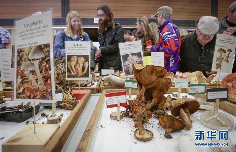 10月21日,在加拿大温哥华,人们观看展出的各种菌菇。 当日,加拿大温哥华举行菌菇展,展出了约300种采摘自温哥华地区的野生菌菇。 新华社发(梁森摄)