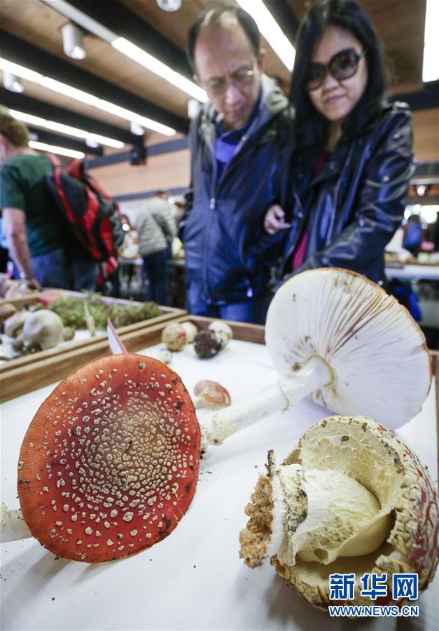 10月21日,在加拿大温哥华,人们观看展出的菌菇。 当日,加拿大温哥华举行菌菇展,展出了约300种采摘自温哥华地区的野生菌菇。 新华社发(梁森摄)