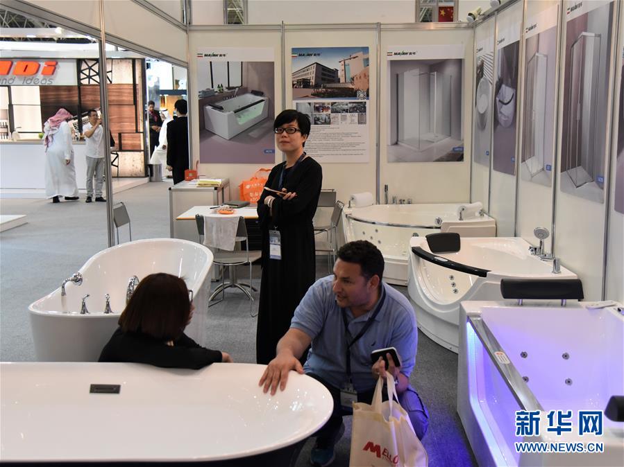 10月22日,在沙特首都利雅得举行的沙特国际建材展上,中国参展商向客人介绍产品。 2018沙特国际建材展22日在利雅得国际会展中心拉开帷幕。此次展会面积达1.8万平方米,设有7个国家展馆,吸引约500家参展企业。展览将持续至10月25日。 新华社记者涂一帆摄