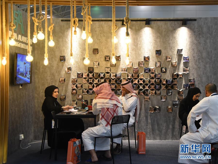 10月22日,在沙特首都利雅得举行的沙特国际建材展上,参展商与客人交谈。 2018沙特国际建材展22日在利雅得国际会展中心拉开帷幕。此次展会面积达1.8万平方米,设有7个国家展馆,吸引约500家参展企业。展览将持续至10月25日。 新华社记者涂一帆摄