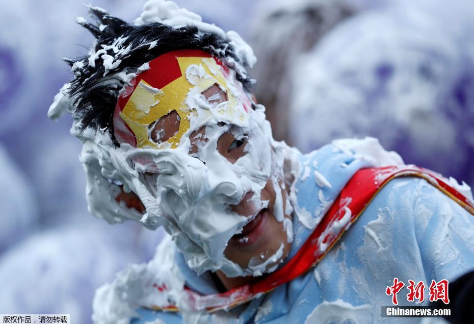 英高校迎新生掀起泡沫大战 学生造型各异满身白沫