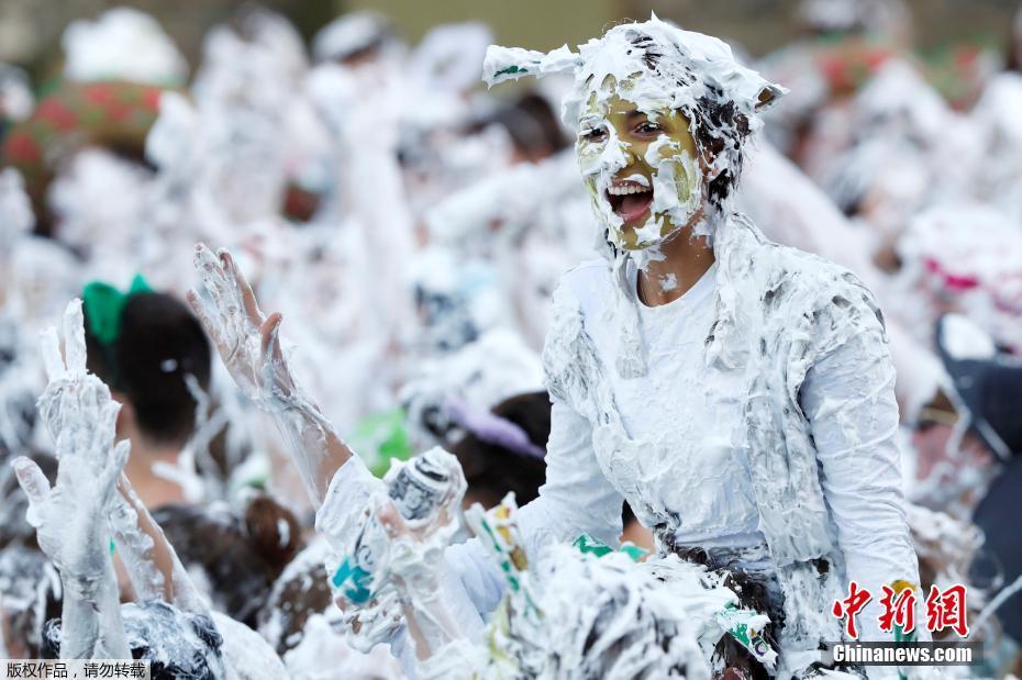 英高校迎新生掀起泡沫大战 学生造型各异满身白沫