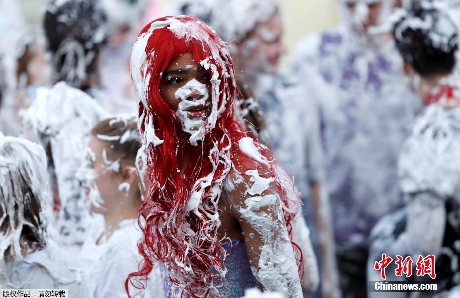 英高校迎新生掀起泡沫大战 学生造型各异满身白沫