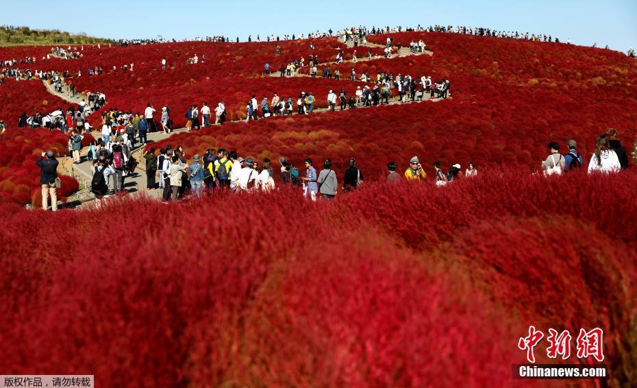 当地时间2018年10月22日,日本Hitachinaka,秋色渐浓,一大片火红花海引游客徜徉其中。