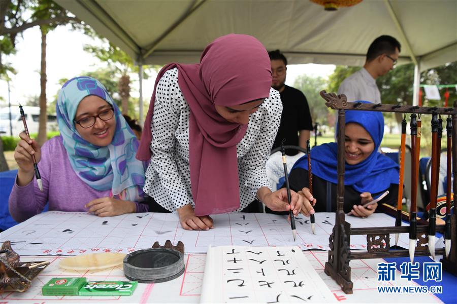 10月23日,在埃及伊斯梅利亚,埃及学生在中国文化周上体验中国书法。 新华社记者邬惠我摄