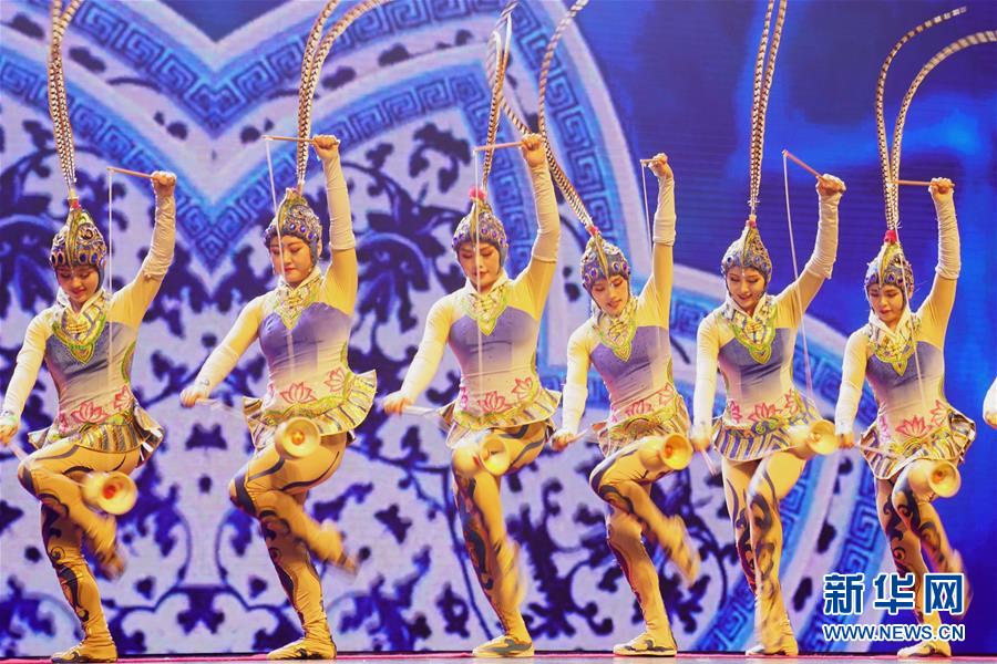 10月23日,在斯里兰卡首都科伦坡莲花剧场,演员表演集体空竹。 新华社记者唐璐摄