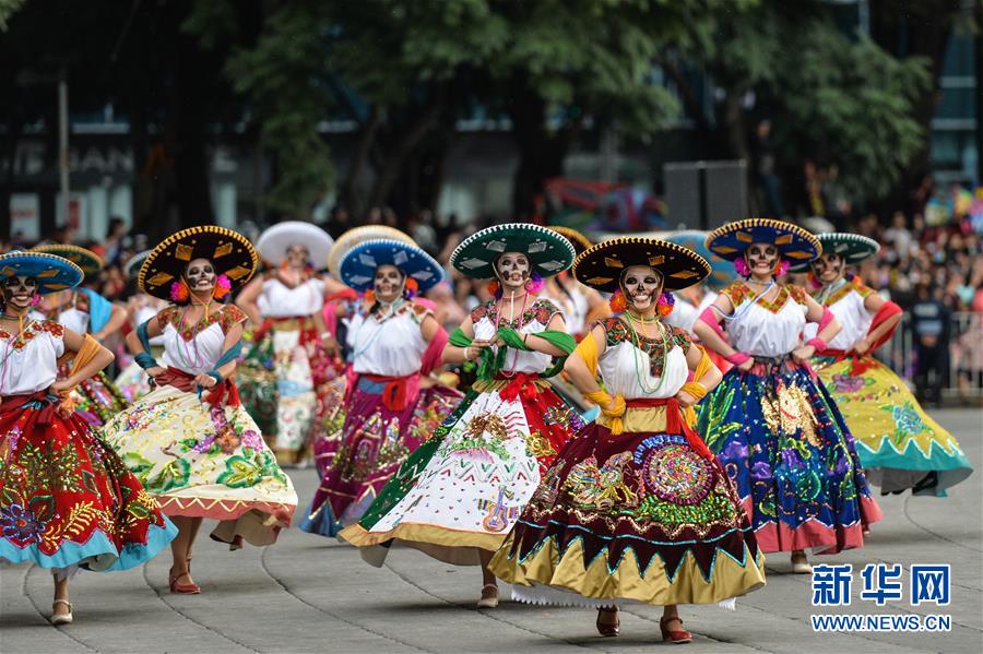 10月27日,在墨西哥首都墨西哥城,人们参加亡灵节游行。 每年的11月1日和2日是墨西哥的传统节日亡灵节,亡灵节是墨西哥最隆重、最独特的节日之一。墨西哥土著人认为,死亡并不是一件悲伤的事情,反而应该用歌舞和五彩斑斓的庆典欢迎亡灵们回家。西班牙殖民者来到墨西哥后,将西方的万圣节传统与当地土著人习俗相结合,创立了亡灵节。2003年,联合国教科文组织将墨西哥亡灵节列入非物质文化遗产。如今,每当亡灵节来临前,墨西哥政府会举行大规模游行庆祝活动。 新华社记者 辛悦卫 摄
