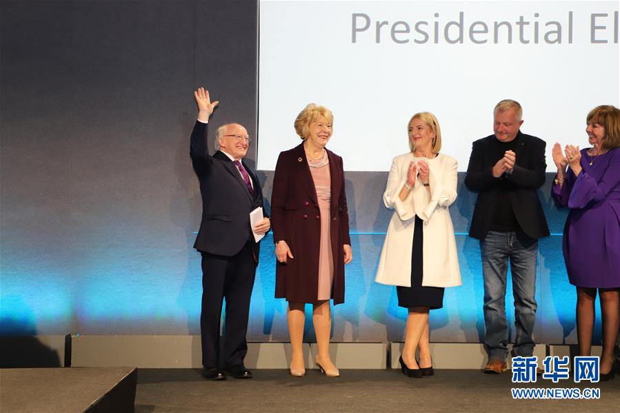10月27日,在爱尔兰首都都柏林,希金斯(左一)在总统选举获胜后向支持者致意。爱尔兰总统选举机构负责人27日晚宣布,爱尔兰现任总统希金斯在26日举行的选举中获胜,再次当选总统。新华社发