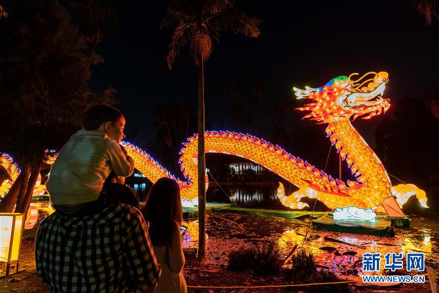 10月27日,在美国洛杉矶县植物园,人们欣赏“中国龙”彩灯。 当日,洛杉矶县植物园举行“月光森林”灯会,展出数十组彩灯,吸引不少游客前来参观。 新华社发(钱卫忠摄)