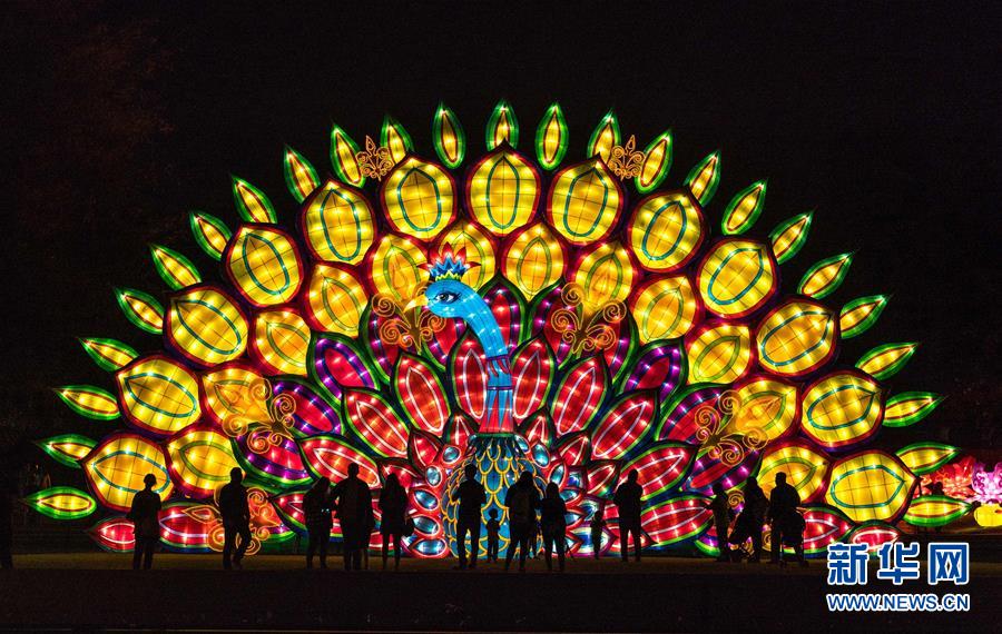 10月27日,在美国洛杉矶县植物园,人们欣赏“孔雀”彩灯。 当日,洛杉矶县植物园举行“月光森林”灯会,展出数十组彩灯,吸引不少游客前来参观。 新华社发(钱卫忠摄)