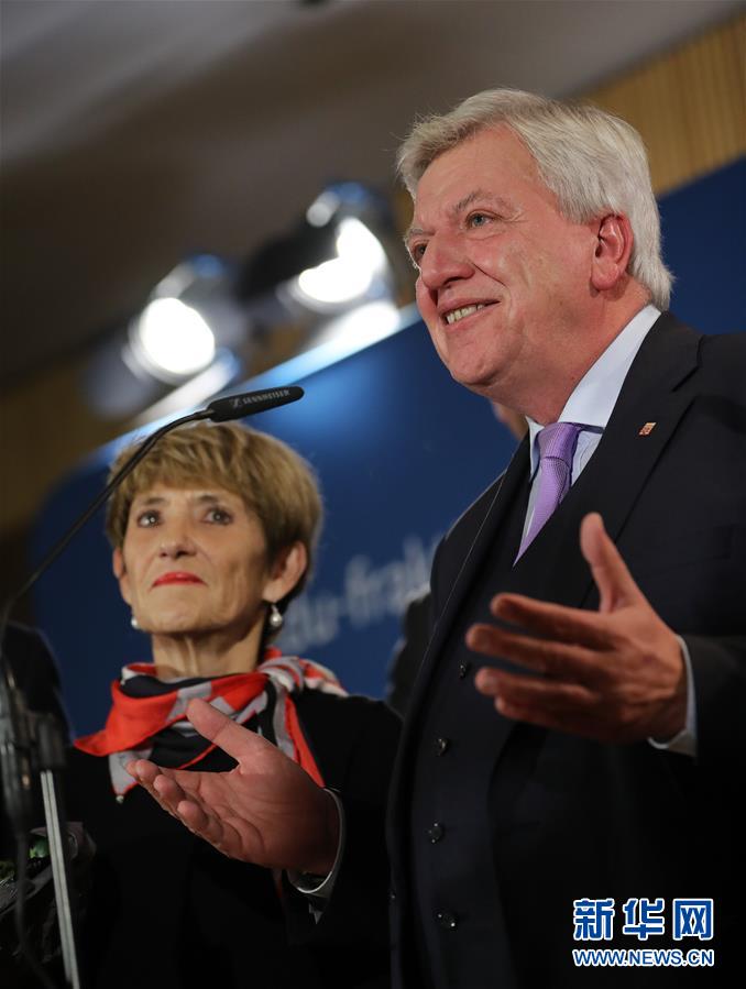 10月28日,在德国黑森州首府威斯巴登,黑森州州长布菲耶(右)在选举初步结果公布后发表声明。 28日公布的德国黑森州议会选举初步结果显示,德国总理默克尔所率基督教民主联盟(基民盟)及其执政联盟社会民主党遭遇重挫,得票下降均超10%。这是德国执政党继巴伐利亚州议会选举以来再度失利。 新华社记者罗欢欢摄