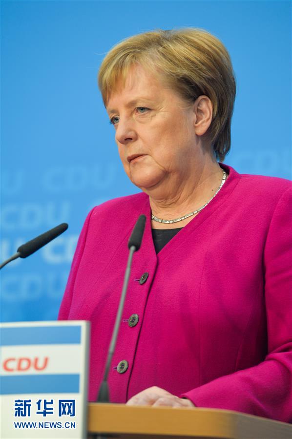 10月29日,在德国柏林,德国总理默克尔在基督教民主联盟党内发布会上讲话。 德国总理默克尔29日表示,在定于今年12月举行的基督教民主联盟(基民盟)党代会上,她将不再参与党主席竞选,未来也将不再竞选联邦总理。 新华社记者 连振 摄