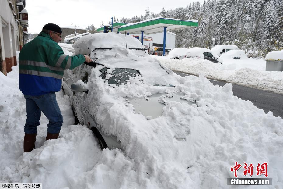 近日,欧洲多国轮番遭遇极端恶劣天气。据外媒报道,强风暴雨近日侵袭意大利大部分地区,至少已经造成19人死亡。西班牙北部地区降雪影响交通正常运行,并导致4700户家庭家中断电。法国遭暴风雪袭击,影响2000辆汽车正常运行,并导致近20万户家庭家中断电。斯洛文尼亚从29日开始处于“红色警戒”状态,而在克罗地亚,临海城市里耶卡被淹,不少铁路交通被中止。图为法国一名男子在清理被大雪覆盖的小汽车。