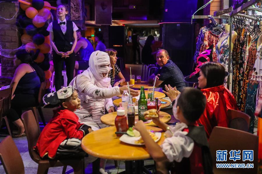 10月31日,民众参与泰国曼谷考山路举行的万圣节庆祝活动。 当日,大量泰国民众与游客齐聚考山路参加万圣节庆祝活动。 新华社记者 张可任 摄