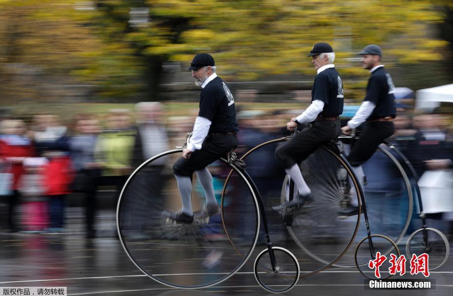 当地时间11月4日,捷克布拉格,民众穿着复古服装,骑“大小轮”古董自行车参加一英里骑行比赛。
