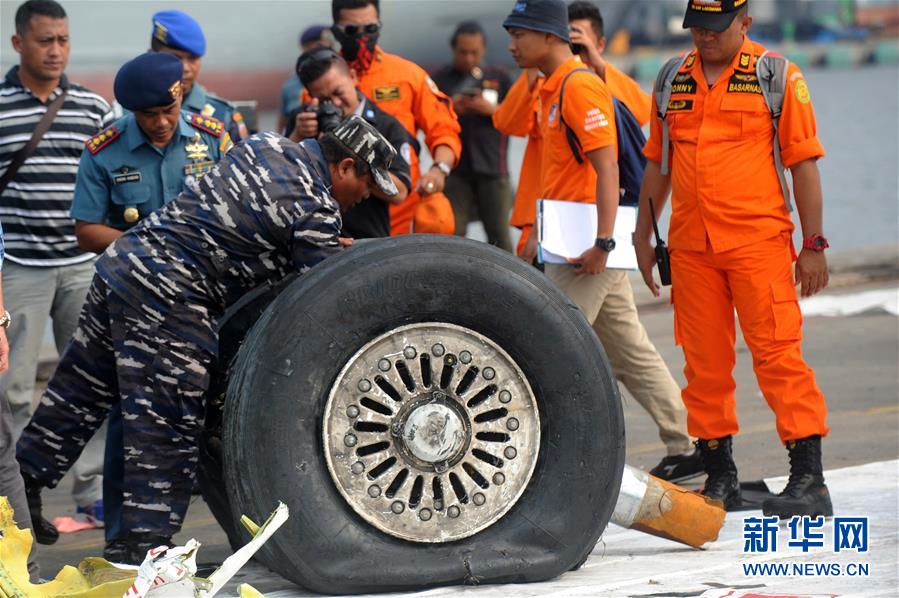 11月3日,在印度尼西亚雅加达,调查人员检查失事客机轮胎。 2日,由869人组成的联合搜救队成功打捞起失事客机起落架及轮胎。此外,119名专业潜水员在海底发现失事客机引擎和大量残骸。由于海底洋流力量强大,搜救行动受到不小影响。 新华社发(阿贡 摄)