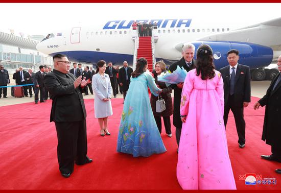 朝中社说,金正恩同志和李雪主女士热情迎接迪亚斯-卡内尔同志和莉斯·奎斯塔女士。