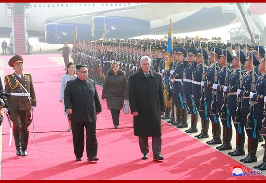 金正恩同迪亚斯-卡内尔检阅仪仗队。(朝中社)