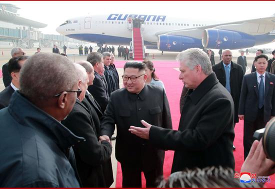 金正恩同古巴随行人员亲切问候。(朝中社)