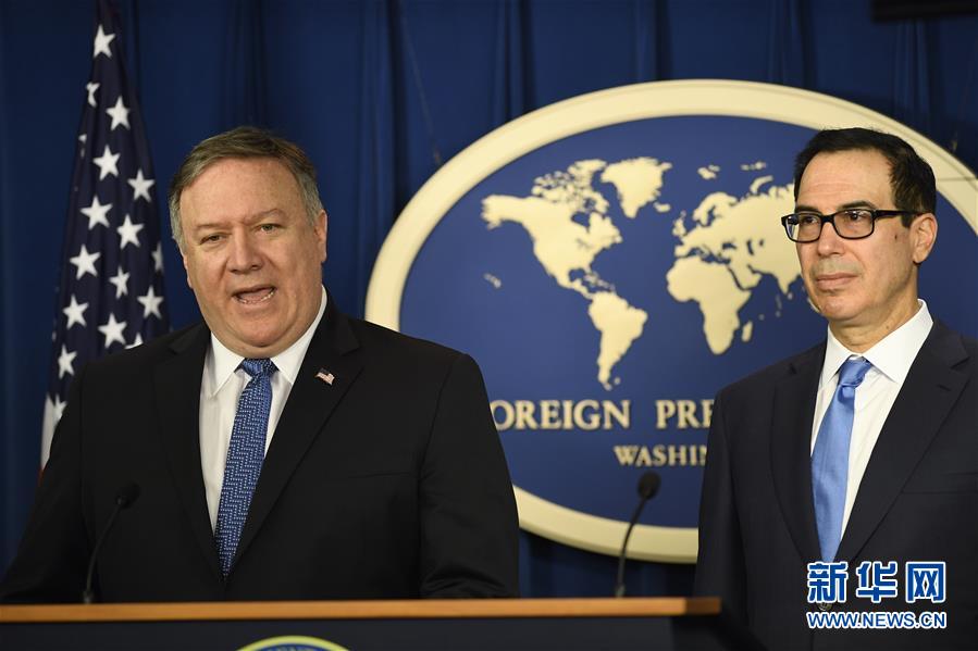 11月5日,在美国首都华盛顿,美国国务卿蓬佩奥(左)和财政部长姆努钦出席记者会。新华社记者刘杰摄
