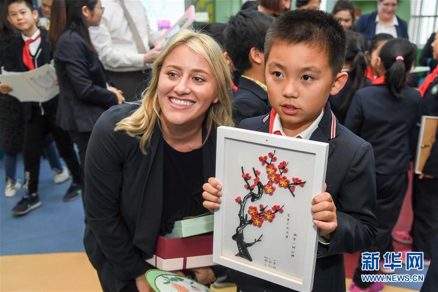 11月5日,来自英国的教师凯莉·泰伯与合肥市南门小学手工社团的小学生合影。 当日,来自英国的7名中小学教师来到安徽省合肥市南门小学,参观、体验学校的特色课程及学生社团活动。本次活动旨在增进中英学校间在文化教育方面的相互了解,分享彼此的教学经验。 新华社记者 张端 摄