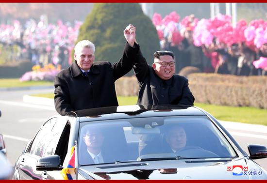 金正恩与古巴领导人同车巡视 牵手过头顶