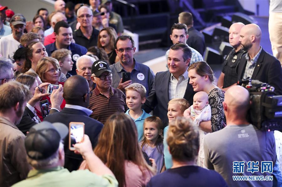 11月5日,在美国得克萨斯州休斯敦,共和党参议员候选人克鲁兹(中右)在竞选活动中与支持者合影。