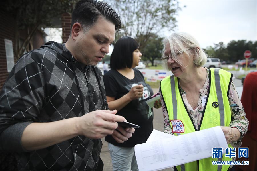 11月6日,工作人员在美国得克萨斯州休斯敦的一个投票站外帮助选民查询信息。美国6日举行2018年中期选举。 新华社记者 王迎 摄