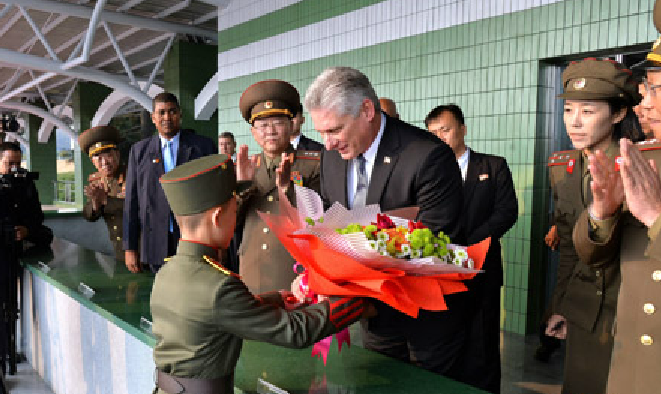 随后,迪亚斯-卡内尔同金秀吉一起检阅万景台革命学院仪仗队。学院学员向迪亚斯-卡内尔献花。