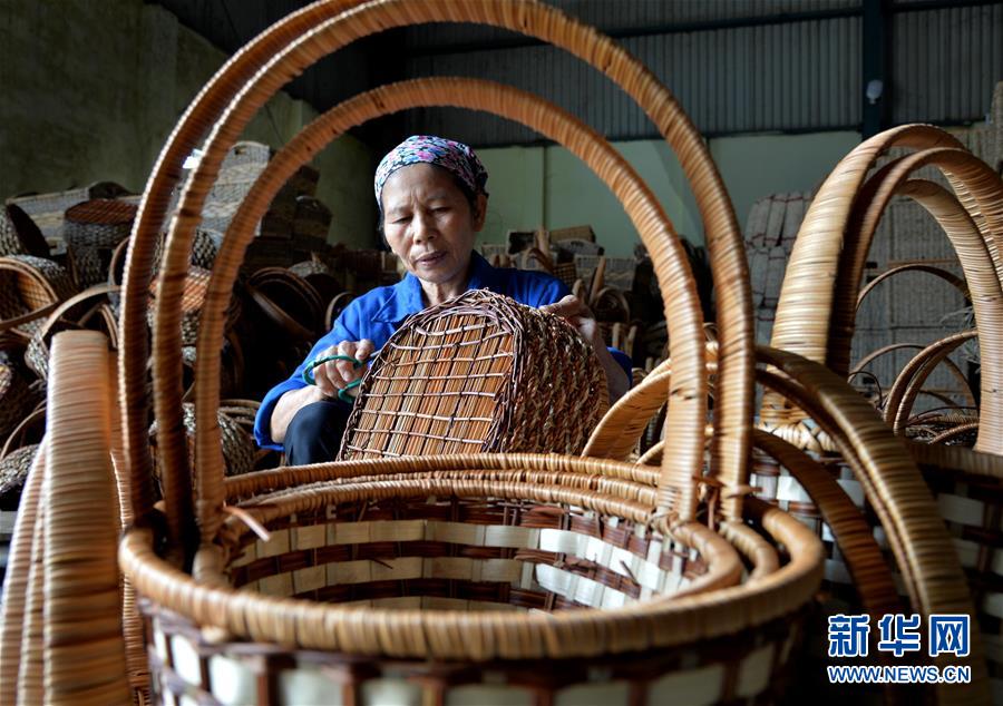 11月6日,在越南首都河内的富川县富足村,村民整理编制的竹篮。新华社发(吴明进摄)