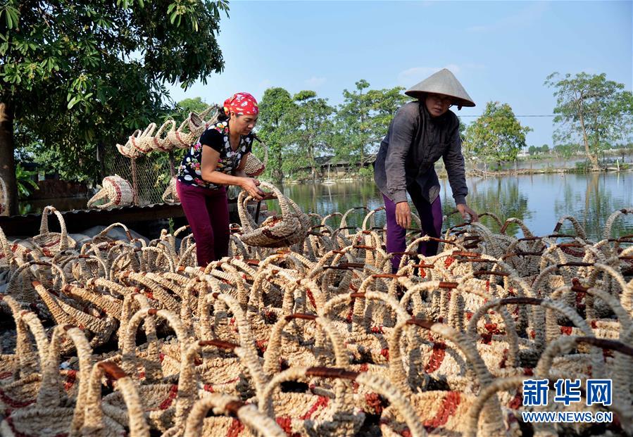 11月6日,在越南首都河内的富川县富足村,村民晾晒编制好的产品。新华社发(吴明进摄)