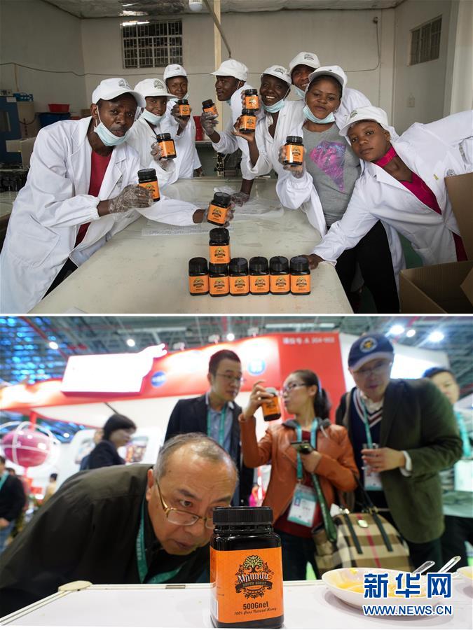 这是一张拼版照片,上图为:11月2日,在赞比亚中央省省会卡布韦市,睦朋得野生蜂蜜有限公司员工展示产品(新华社记者彭立军摄)。下图为:11月8日,在首届中国国际进口博览会上,一名参观者在睦朋得野生蜂蜜有限公司展台观看蜂蜜展品(新华社记者程丽摄)。睦朋得野生蜂蜜有限公司表示,希望借此机会向中国消费者推介赞比亚优质蜂蜜。 新华社发