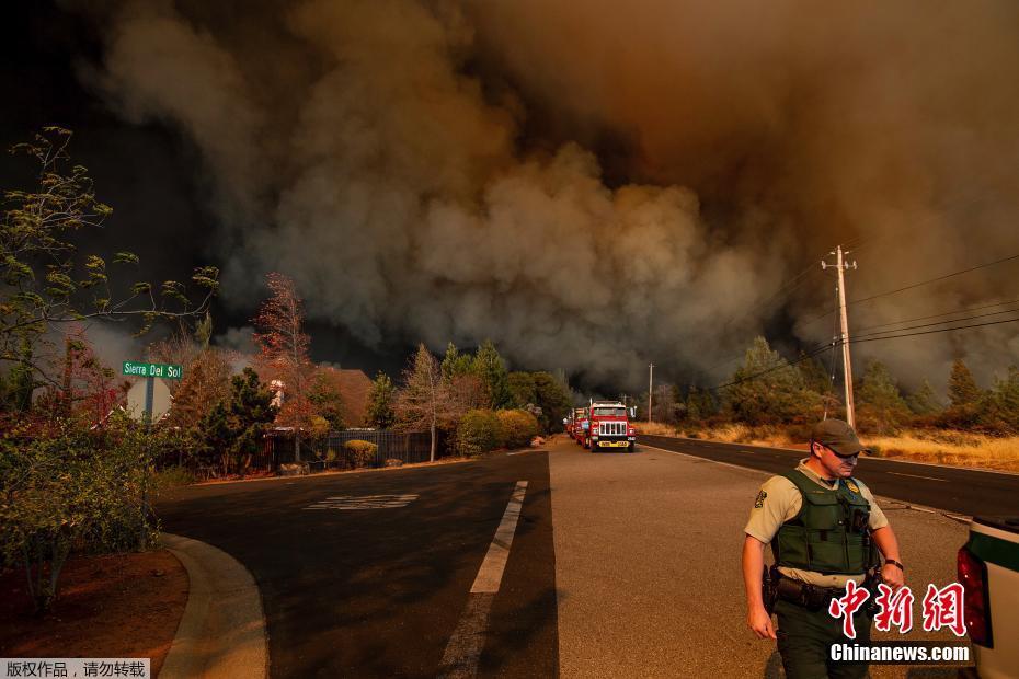 当地时间11月8日,美国加州Paradise发生火灾,烈火熊熊。在大风和低湿度的推动下,火势迅速蔓延,已席卷了周边城镇。在短短几小时内,超过1.8万英亩的土地被烧毁,一家医院、一个加油站和几十所房屋也被烧毁。图为美国加州消防车从火灾区域撤离。