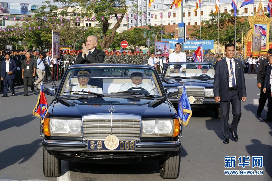 11月9日,在柬埔寨首都金边,柬埔寨国王西哈莫尼(前车站立者)出席独立日庆祝活动。 新华社发(索万纳拉摄)