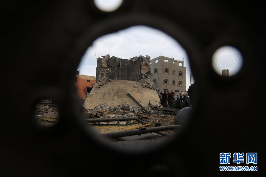 这是11月12日在加沙地带汗尤尼斯拍摄的一处被毁建筑。巴勒斯坦卫生部官员12日凌晨宣布,11日以色列在加沙地带南部城市汗尤尼斯的军事行动已导致7名巴勒斯坦人死亡。新华社发(哈立德·奥马尔摄)
