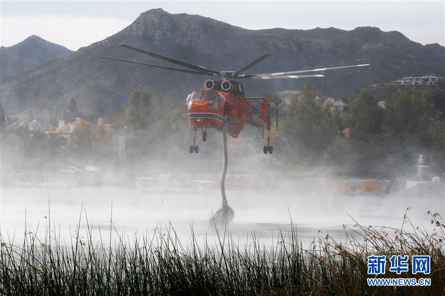 11月13日,在美国加利福尼亚州文图拉县绍森欧克斯,消防飞机取水参与灭火。 加州南部洛杉矶县和文图拉县两处规模较大的山火“伍尔西”和“希尔”仍在燃烧,已导致2人死亡,焚毁建筑500多幢。 新华社发(钱卫忠摄)