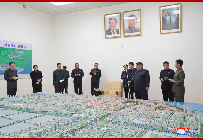 金正恩还要求,新义州应当像其他边关城市一样,多盖现代化、有民族特色的雄伟建筑,打造高层、超高层住宅区,增建公共建筑、酒店、百货商店等。(图源:朝中社)