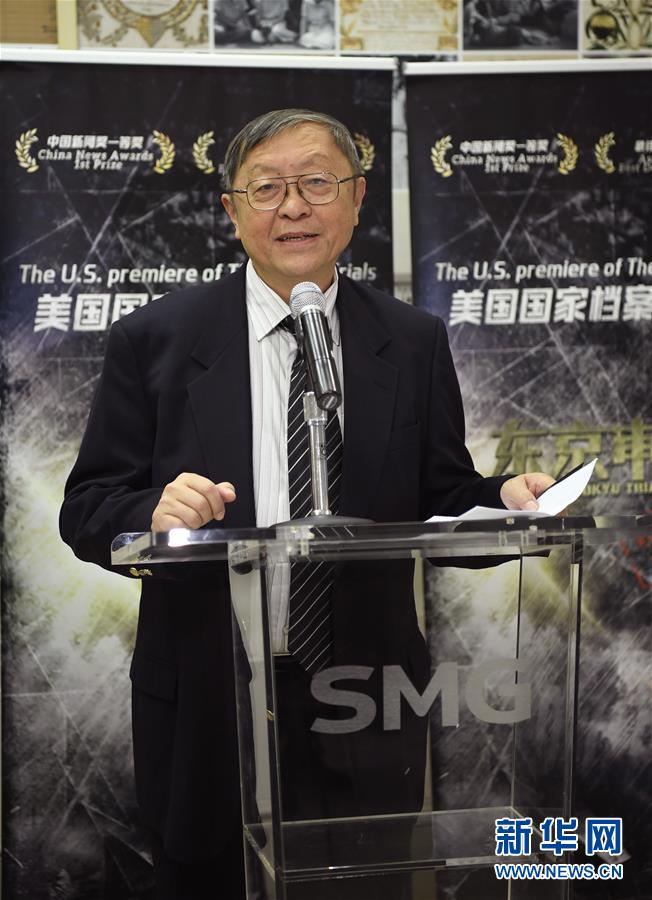 11月15日,在美国华盛顿,中国检察官向哲濬之子向隆万在美国国家档案馆展映仪式上致辞。为纪念远东国际军事法庭在东京宣判二战期间日本主要战犯70周年,美国国家档案馆15日晚展映了3集中国电视纪录片《东京审判》。新华社记者 刘杰 摄