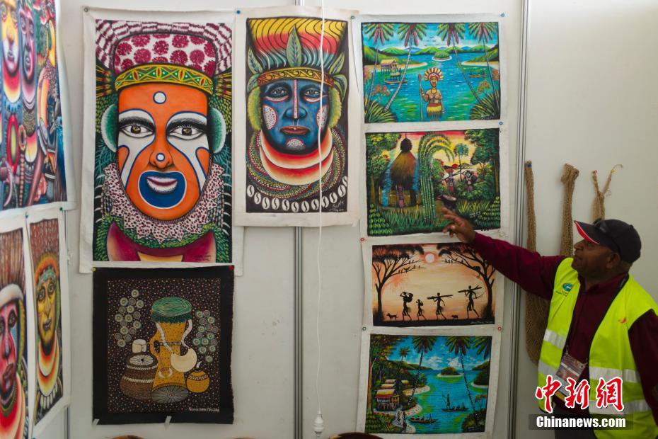 设在港口旁的小市场内,商贩向顾客推销艺术品。中新社记者 盛佳鹏 摄