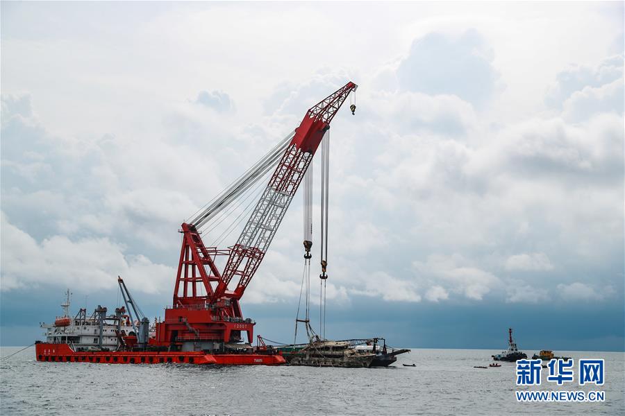 11月18日,在普吉岛附近海域,工作人员将打捞出水的“凤凰”号游船拖离事发水域,转移上岸。 新华社记者 张可任 摄
