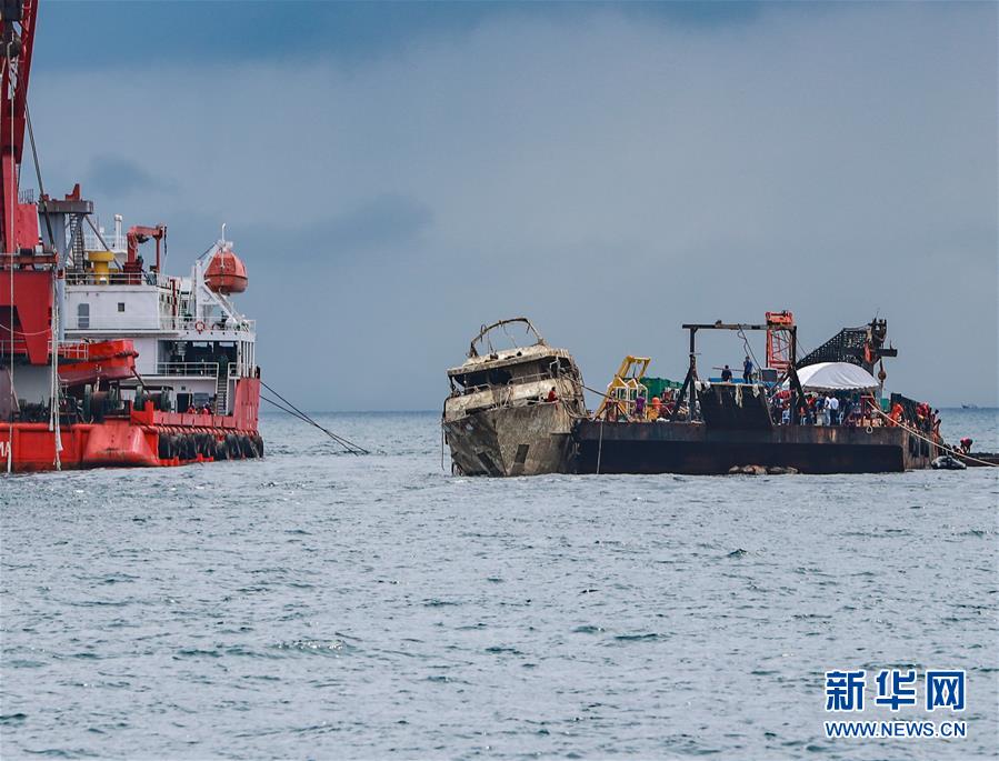 11月18日,在普吉岛附近海域,工作人员将打捞出水的“凤凰”号游船拖离事发水域,转移上岸。 新华社记者 张可任 摄